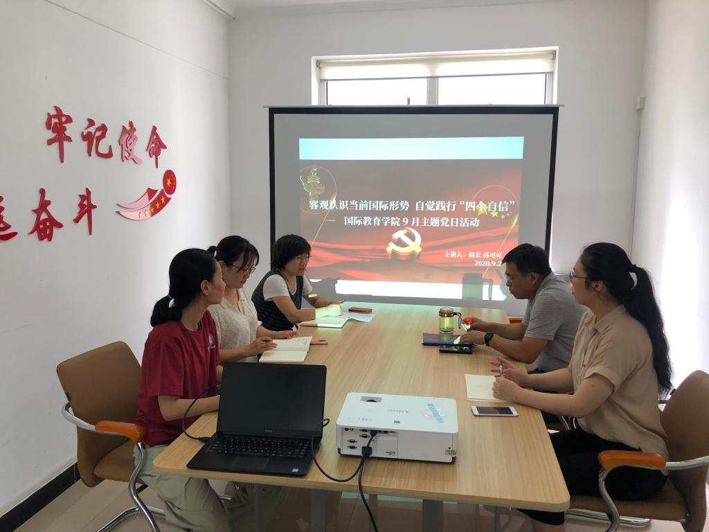 院长苏可可同志以“客观认识当前国际形势,自觉践行‘四个自信’”为题讲党课,他围绕着2020年新冠疫情的爆发、中美关系的发展、四个自信的重要意义以及当前国际化办学的重任等几个方面,为全体党员上了一堂高度深刻且生动的党课。他指出目前疫情反复,国际形势变化莫测,各种不确定因素直接或间接的影响每一个人的生活工作和学习,也对国际化办学产生了巨大的挑战,但是我们在困难面前必须迎难而上,必须坚持习总书记提出的“四个自信”,践行四个自信,这次疫情的胜利充分证明中国共产党和中国人民是不可分割的,充分证明我们的道路、制度都是符合中国国情和实际的,是又一次被实践证明了的中国共产党和社会主义制度是中国人民的正确选择。他要求每名党员不断提升党性修养,在政治上更加坚定,在思想上更积极向党组织靠拢,在学习、工作、生活中发挥好模范带头作用。同时也要立足学院实际,实事求是,脚踏实地,从思想深处坚持四个自信,体现自我价值。