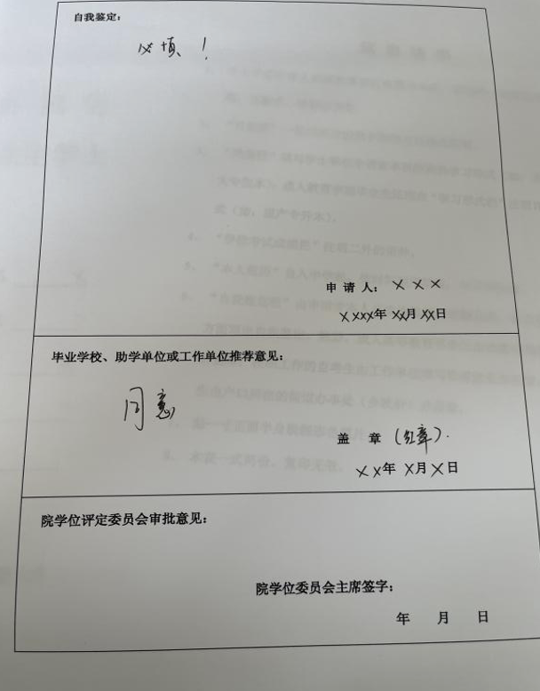 要求:本人如实填写(手写),根据实际情况由继续教育学院或工作单位或居住地社区填写推荐意见,盖好公章。(毕业学校、助学单位或工作单位推荐意见)处必须盖章。
