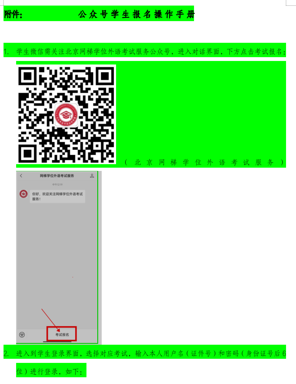 移动端报名公众号:需关注北京网梯学位外语考试服务公众号,详见《公众号学生报名操作手册》(详见附件)