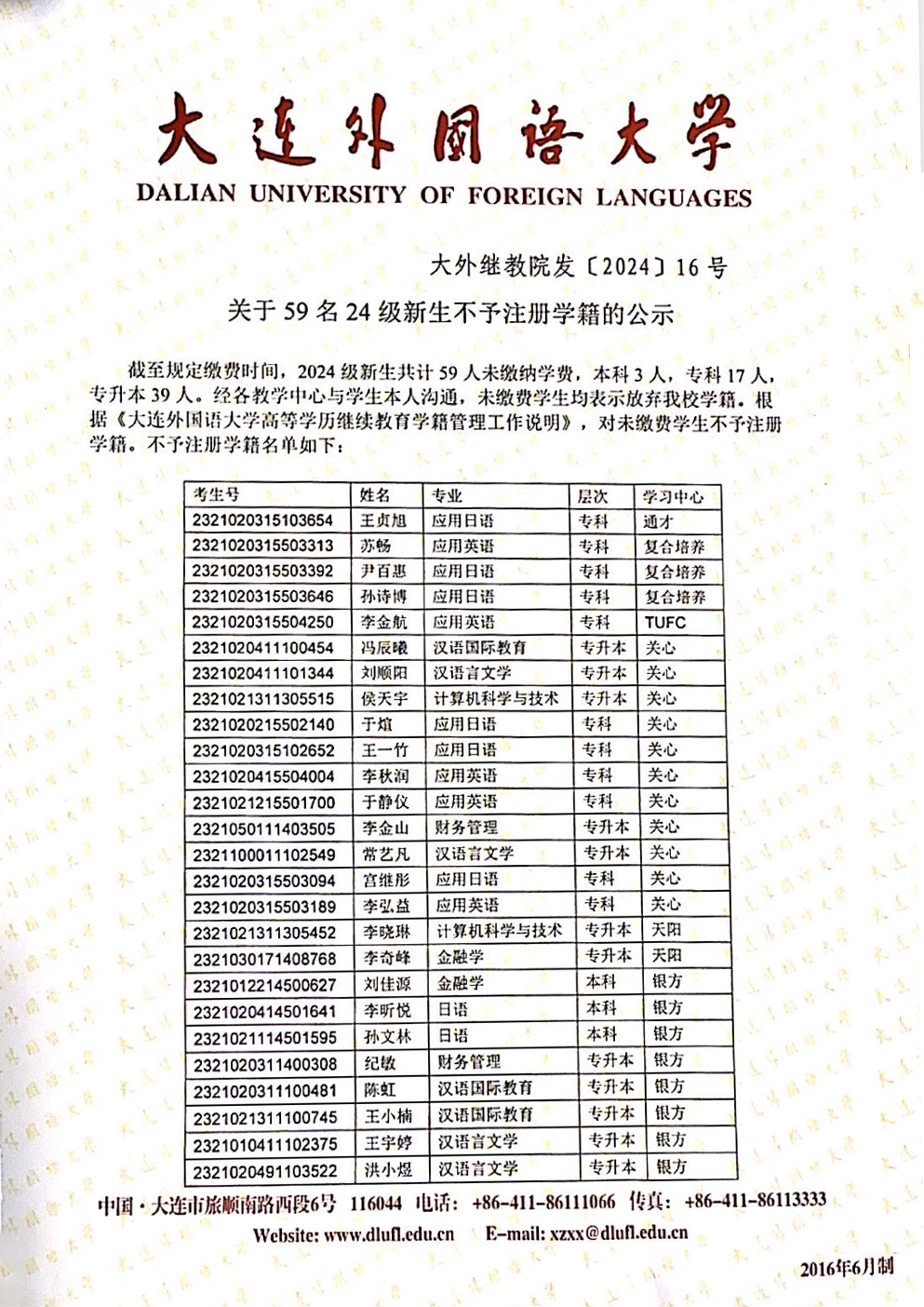 关于59名24级新生不予注册学籍的公示